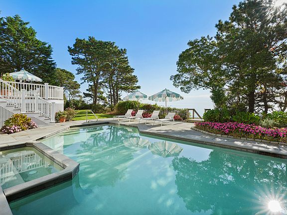 For those seeking an exceptional waterfront lifestyle, this New Seabury masterpiece boasts a private sandy beach and panoramic views of Nantucket Sound, located steps from five-star resort amenities. Set in the exclusive enclave known as The Bluff, the property features a stunning six-bedroom residence with a waterside pool and outdoor kitchen just a stone's throw from your beach. Highlights include an open-concept living area with soaring ceilings and unobstructed views, a gourmet kitchen, and a fully finished walkout lower level with a media room. On the second level, wake up to enchanting sunrises over the ocean in the primary suite with a private balcony. Five well-appointed guest bedrooms in the main residence and a two-bedroom guest house offer flexibility for multigenerational living, staff, or guests. A perfect spot to entertain or simply relax, this extraordinary property is minutes from New Seabury's championship golf courses, tennis, marina, fine dining, and more.