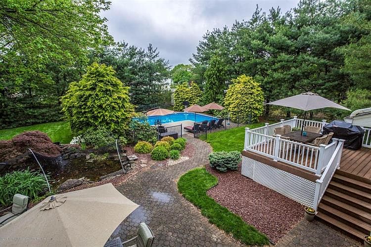 Beautifully updated, immaculate home in a desirable neighborhood near the Colts Neck border. Perfect for entertaining and carefree daily living! The spacious kitchen features maple cabinets w crown molding, stainless steel appl, granite counters and breakfast bar. Distinctive features include wood floors (some under carpet), Andersen windows, all updated bathrooms, recessed lights, crown moldings. Living room w beautiful Andersen bay window and gas fireplace. Family room has built-in surround sound speakers. Gorgeous resort-like fenced-in yard, featuring an L-shaped heated pool, koi pond, Trex deck, paver patio w gas hookup, and so much more! Newer furnace, HWH, pool heater, filter and liner. Just move in and enjoy this wonderful home and ideal location, close to Route 18 for easy commuting. Must see!