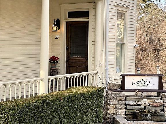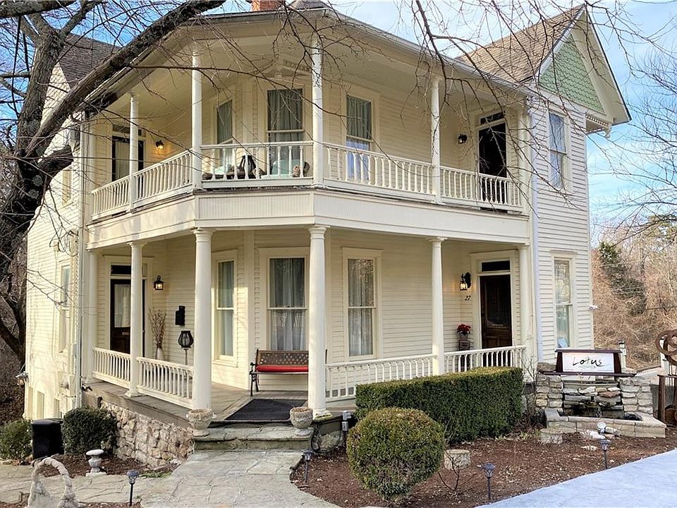 This stately Victorian home has been awarded a Eureka Springs Preservation Award for Restoration and has been featured on numerous Holiday Home Tours. The home is zoned for commercial use and is currently operated as Lotus House, a successful tourist lodging establishment with four upscale spa-like suites. The home has beautiful vintage heart pine floors, architectural elements, original moldings and some stained and leaded glass windows. Large wrap-around porches on each level in the front provide a great spot to relax. Covered porches also stretch across the back and overlook the stone patio. Stone steps wind around the side of the house to the stone courtyard with gardens creating a beautiful spot for weddings. The furnishings are included in the sale, so the business would be turn-key. The home could be easily used as a private residence with no lodging and still keep its zoning. There is off-street parking for each suite. You'll enjoy the short walk to downtown shopping and dining or catch the trolley.