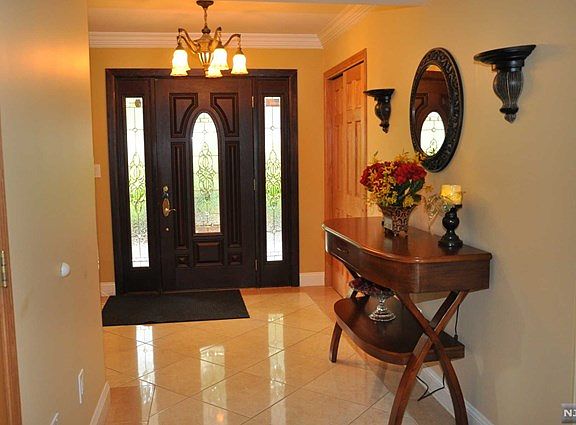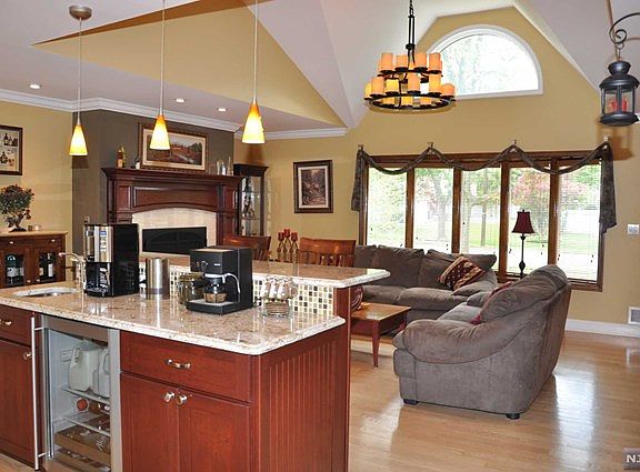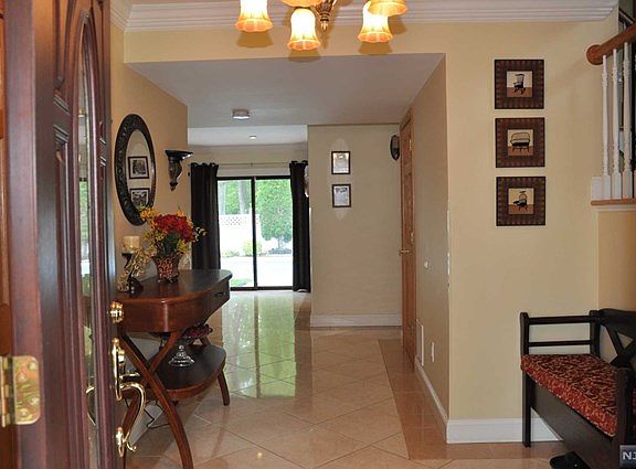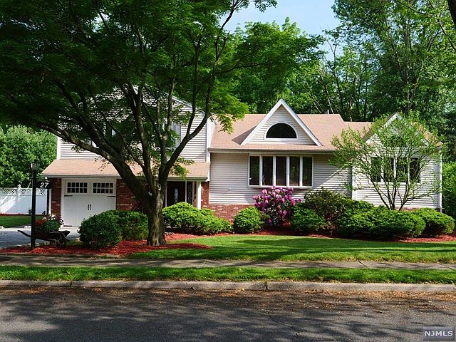 Welcome to this exclusive neighborhood where homes sit on 100-foot frontage and bordering wooded area (protected land). Walk into foyer with full view of inground pool through the back sliding patio door. Family room with corner fireplace and full bath right off the patio door for convenient, easy access from the pool area. The 2nd fl offers a large LR, open to upscale kit leading to FDR w/ cathedral ceilings and stone fireplace. The 3rd fl has 3 large bedrooms with 2 closets in the master and direct access to full bath. There is a huge deck with stairs to beautiful yard with solar heated pool (9 ft deep w/ diving board), fruit trees and outdoor fireplace area. The one-car garage has been outfitted with the Trek system for storage and organization. The paver driveway fits 4 cars. Owner has NJ RE Lic.