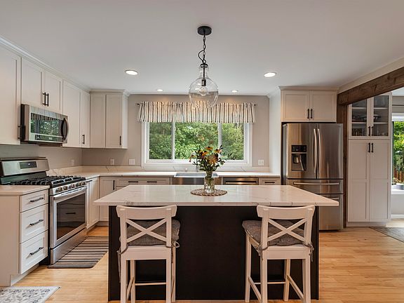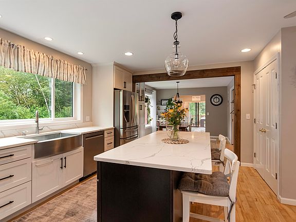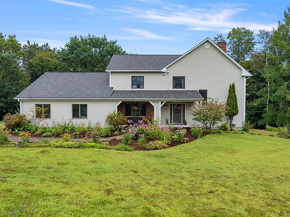 Nestled on a tranquil 5-acre lot with seasonal views of Mt. Mansfield, this exceptional 3 bedroom, 4 bathroom property boasts modern updates and abundant features for comfortable living. The home features a brand-new kitchen with quartz countertops and new appliances (installed in 2021), complemented by birch wood floors and new windows throughout. The spacious living room showcases a cozy wood stove and slate tile. The open foyer, formal dining, secondary dining and first-floor open office add to the home's inviting atmosphere. The newly partially finished basement offers a workout room, a kitchenette, workshop with expansive counter work space, and additional storage. The home boasts two spacious primary bedrooms, one with a Juliet balcony and three closets and the other with a walk-in closet, and a newly renovated bathroom with a soaking tub and tile shower and dual vanity. Outdoors, you'll find a detached 4-car garage with space for an RV or boat (40 feet long), as well as rhubarb, fruiting currants, blueberries, plums, raspberries, and pears. Enjoy outdoor living with a large above-ground pool, a side deck, back deck with hammock, and a charming Juliet deck offering seasonal mountain views.The property extends to Browns River, providing a peaceful retreat frequented by wildlife such as deer.
