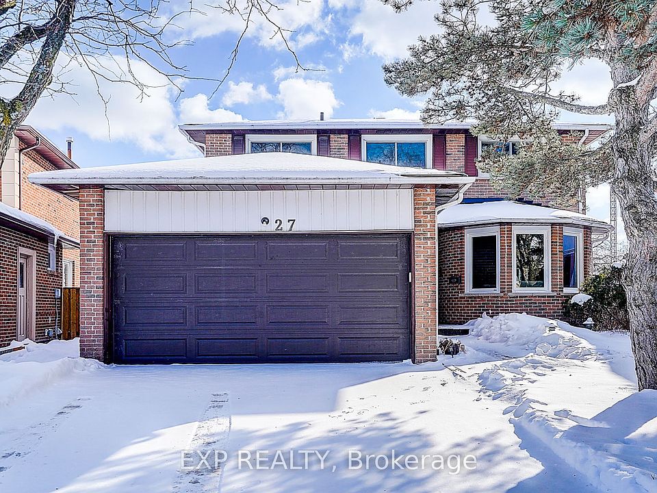 Welcome to 27 Pining Road, a spacious and well-maintained 4+1 bedroom, 4-bathroom home located in the highly sought-after Aileen-Willowbrook community of Markham. This inviting residence features a finished walk-out basement and a functional layout ideal for families. The main floor offers separate living, dining, and family rooms, with an open-concept kitchen and eating area connected to the family room by a half-wall, complete with a cozy fireplace. Tile and hardwood flooring run throughout the main level, complemented by pot lights in the foyer and hallway, a side entrance leading to a mudroom/laundry room, and an elegant curved staircase partially carpeted over hardwood floors. The second floor boasts four generously sized bedrooms with large windows, including two carpeted bedrooms and two with hardwood floors. The primary bedroom is spacious and features hardwood flooring and a private 3-piece ensuite, while a large double-vanity bathroom serves the remaining bedrooms. The fully finished walk-out basement adds exceptional living space with carpet throughout, a bedroom, a 3-piece bathroom with shower, a fireplace, pot lights, three storage closets, and a cold cellar. Offering abundant space, multiple fireplaces, and a versatile layout, this home is an excellent opportunity in a family-friendly neighbourhood close to schools, parks, and amenities.
