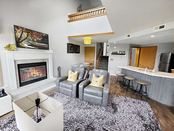 Nicely appointed and updated 1 bed/ 2 bath Poplar Ridge Golf Villa offering stunning views of Eagle Ridge East Course #8 green, a private setting, beautiful panoramas and long vistas of The Galena Territory and beyond! Entry with bead board accents up and down the staircase feeds to airy main floor featuring lots of light, large kitchen with tile flooring, some stainless appliances, and eat-at bar with wood clad accent, open dining area, Murphy Bed for the convenience of extra guests, comfortable living room with cathedral ceiling, wood-burning fireplace featuring tile surround and beautiful mantel, updated laminate flooring and vaulted ceiling, and full bath with more tile flooring and shower unit. Ascend to the upper level to find lofted overlook with sitting area, inviting master bedroom with cathedral ceilings, updated carpet, spectacular elevated views, and private bath with tile flooring, tile surround tub/whirlpool combo and large vanity. Take in the beautiful golf views and surrounding scenery from the generous rear deck, or relax on the cozy front porch. Sold furnished to be negotiated by separate bill of sale. 2021 annual association fee of $1137 and 2021 monthly association fee of $240 are applicable.