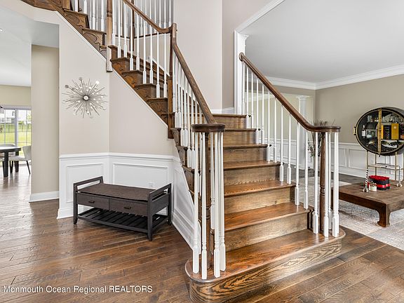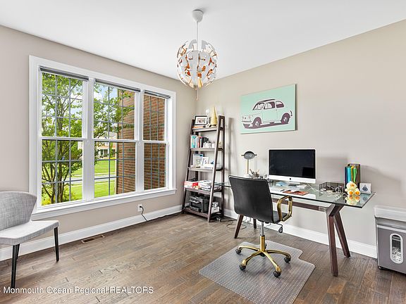 Gorgeous 5-year old brick front colonial in highly sought after neighborhood in North Howell features 4 bedrooms, 2.5 bathrooms plus a first floor office. You'll love the 2-story foyer, gleaming hardwood floors and beautiful staircase as you enter the home. Next you'll see the gourmet kitchen with high end appliances, large center island and pantry. The 2-story family room boasts an entire wall of windows, gas fireplace and back staircase to the upstairs bedrooms. The master bedroom has a vaulted ceiling, beautiful master bathroom and a dreamy walk-in closet. Looking for a nice backyard? This one has a custom patio great for entertaining with a built-in wood fire pit, fenced in yard and plenty of room for a pool.
