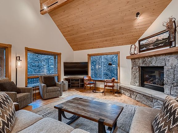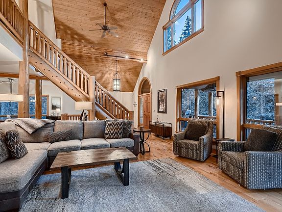 Step into your private sanctuary, a secluded retreat surrounded by ancient spruce trees, spanning 1.6 acres! This enchanting home offers an oasis of tranquility with numerous outdoor spaces to bask in relaxation. The expansive open living area delights with its soaring vaulted ceilings, complemented by a warm gas fireplace and abundant large windows that seamlessly blend the indoors with nature's beauty. On the main level, you'll find a generously-sized primary bedroom, and every bedroom comes with its own ensuite bathroom, ensuring utmost convenience and comfort for all. Situated just 6 miles away from downtown Breckenridge, you can easily enjoy the best of both worlds - the peaceful seclusion of your retreat and the vibrant offerings of the town. Inside, you'll discover multiple living areas, including a cozy lower family room, an inviting upper loft, and the main living area, providing ample space to unwind and create cherished memories. Your mountain paradise awaits, promising an idyllic escape from the bustle of everyday life.