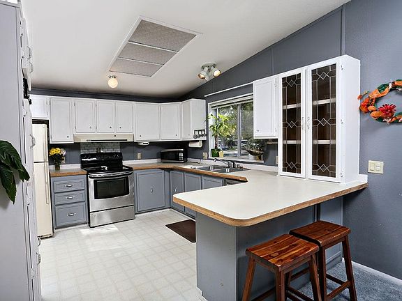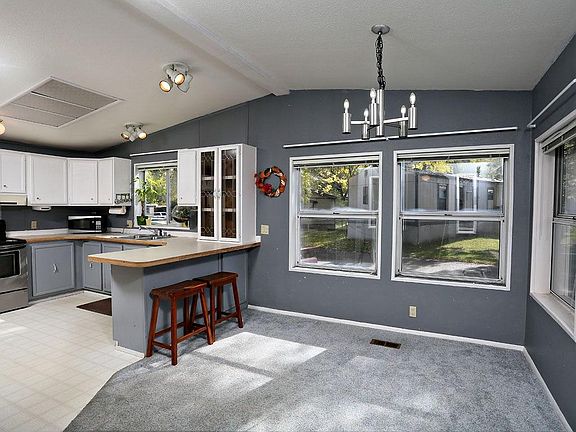 One level living on a corner lot - large master suite with walk in closet, soaker tub, large windows! Spacious dining and living room, dishwasher less than a year old, tons of natural light. Water softener, carport + shed. Lot rent includes plowing roads, park maintenance, and jacuzzi maintenance. Chandelier in master bed does not stay.