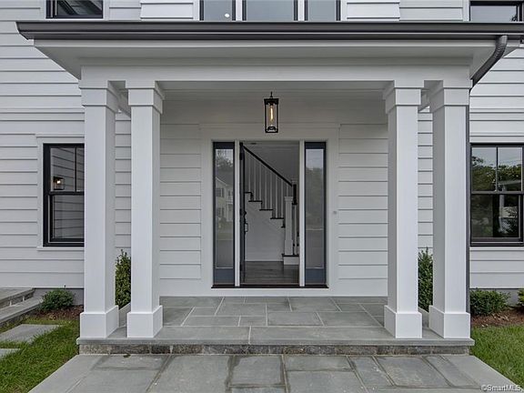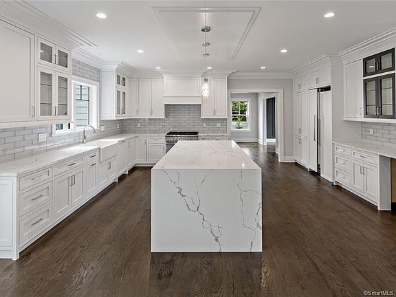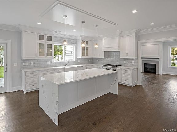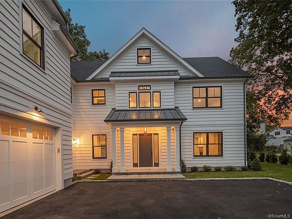 27 Raymond Street is a hidden charm in the heart of New Canaan! Located on a cul-de-sac, this new construction, modern colonial is a short walking distance to all the shops, restaurants, and the train station. The main entrance of the home welcomes you into a grand two story foyer with stunning hardwood floors and wainscoting. Open concept floor plan provides a custom chefs kitchen with large island, all Thermador appliances and walk-in pantry that is open to a family room with custom built in and fireplace. Slider access to a blue stone patio and backyard make this house perfect for entertaining! First floor also has a living room with fireplace, office with separate entrance and formal dining room. The master bedroom suite has separate his/her walk-in closets and a luxurious bathroom with soaking tub, standing shower and dual vanity. Four additional bedrooms upstairs have en-suite bathrooms. Lower level includes 6th bedroom with en-suite bathroom, large playroom and additional space that can be used as a wine room. Finished spacious walk up third floor.