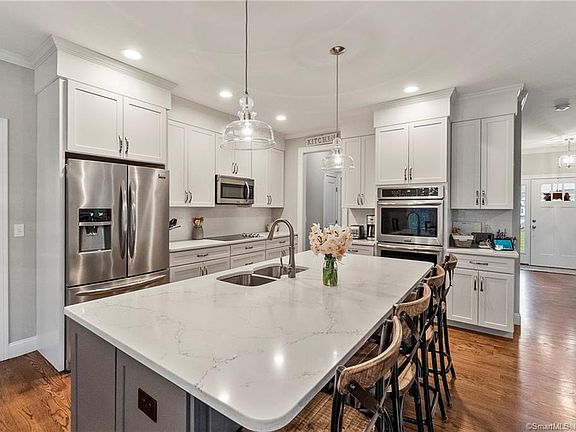 Welcome Home! The expansive newer construction Colonial home is sure to please! Custom finishes await as you enter through the foyer and make your way to the open concept floor plan and main living area which is great for entertaining! The Quartz kitchen counter tops make a beautiful landscape for modern lighting, stainless steel appliances, a tile backsplash and custom cabinetry. Living room has gas fireplace with tile surround and exterior access to the newer paver patio and retaining wall (2021). Back Mudroom offers tons of space and a coat closet, 1/2 Bath, separate Laundry room and Garage access. An Office/Den and 1st floor Bedroom finish off the main level. The Primary Bedroom Suite is large and has a long walk in closet with custom shelving and racks and a bathroom with tiled shower stall, free standing soaking tub, and a double vanity sink with marble counter tops. A huge bonus room over the garage can be used as a 5th bedroom/music room/family room with closets and a ceiling fan. 2 additional Bedrooms and a Family Bath complete the second level. A full basement with a generous ceiling height provide room for storage and adds flexibility if there were a need to create more living space. Some additional features include central air, recessed lighting on main level, tons of storage throughout the house, yard was recently regraded to direct water away from home towards wetland area, older mop sink in laundry room built in and a nice front porch to enjoy!