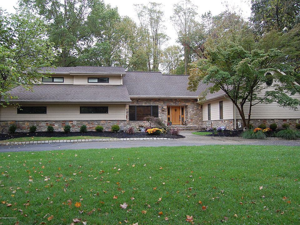Very chic home in the reservoir section of Colts Neck. This nicely updated home features; . The exterior of this two-story structure is natural stone and CertainTeed vinyl siding. It boasts two master suites, one on the 1st floor and one on the 2nd.. The sunken family room has a cathedral ceiling and a stone fireplace. The updated kitchen has Thermador professional appliances including a 6 burner stove and double wall oven. It also has a Sub Zero refrigerator/freezer and 50 bottle wine cooler. All bedrooms have hardwood floors. The two-story entryway has travertine tile. Pella casement windows with built in shades throughout. The circular driveway leads to a 4 car garage. Very private park like yard with a wonderful deck and lot of trees.