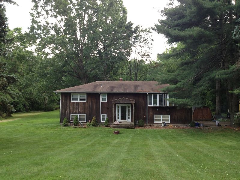 Spacious home set back from the road with private level back yard. Hardwood floors, large open family room, formal dining room with sliders onto large deck and bright kitchen with double oven.2 fulls baths and one bath roughed for plumbing needs to be finished. Home is being sold "AS IS" which is reflected in the price, inground pools in need of repairs. Cedar siding!