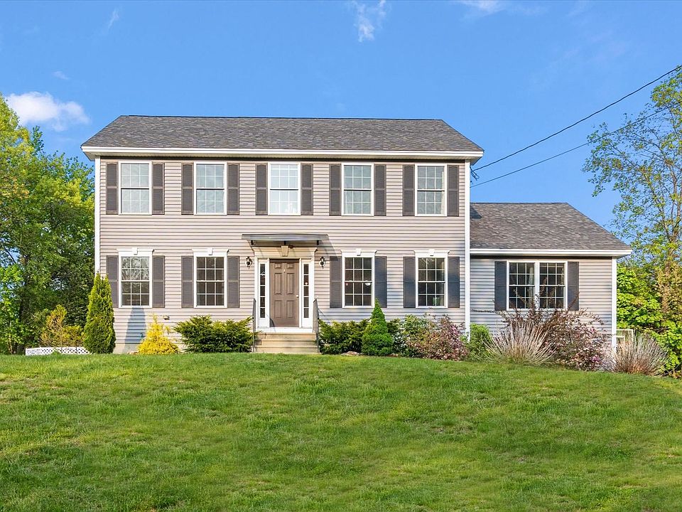 AN IMMACULATE COLONIAL WITH COMMANDING SUNSET VIEWS…A LIFESTYLE BY DESIGN! Preeminently sited on a gentle hill with easy access to major roadways, shopping, dining and award-winning schools this is the home that everyone wants! As you enter you’ll appreciate a grand sense of open, sun-filled space. An expansive dining room awash in soothing gray tones graced by crisp white wainscoting flows effortlessly into the well-appointed kitchen where guests will pull up a seat at the island or the granite peninsula for charcuterie and cocktails with the cook. Conversation will naturally flow through the breakfast nook and out sliding glass doors to an elevated deck overlooking a fence-lined backyard primed for outdoor fun. Spend lazy alfresco afternoons barbecuing and when temperatures soar you'll love cooling off in the sparkling above ground pool or sunning yourself on the deck as you vacation at home. Gather to watch the big game in the living room featuring an airy cathedral ceiling and warming gas fireplace. A first floor bedroom makes things convenient or transform it into an office perfect for work-from-home. Pamper yourself at day’s end in the primary retreat featuring ensuite bath and walk-in closet and two sizable additional bedrooms and convenient second floor laundry will delight. The finished daylit lower level will make everyone happy with a mudroom that easily collects coats, boots and hats. IDEALLY LOCATED AND PERFECTLY SITED...MAKE THIS YOUR FOREVER HOME TODAY!