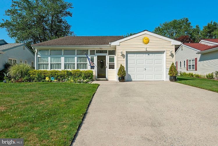 Beautiful lake front, well maintained home, in Leisuretowne! Walk inside to be greeted by a warm and welcoming front sun room and front door which opens to a spacious living room and dining room. Down the hall you have a nice sized laundry space, full bathroom and two bedrooms. The master bedroom has lake views, walk in closet and private bath with a walk-in stall shower. The kitchen has plenty of storage space, accommodates a nice size breakfast table and opens up to a lovely back family room with gorgeous views of the lake. The family room has wall to wall efficient windows, an electric fire place and access to the outside patio. The lake front patio has a retractable awning to make it fully functional for all outdoor dining and entertaining activities. The garage is front facing, has room for storage and access to the sun room. The Leisuretown community focuses on peaceful living with its multiple lakes, community centers, pools, activities and classes and best of all, Low Taxes and HOA fees! This is a must see home, call to schedule an appointment today!