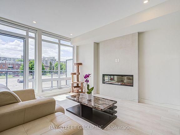 This luxury 3-bedroom townhouse features 9-foot smooth ceilings throughout. Sunlight pours in through floor-to-ceiling windows showcasing park views. The open-concept kitchen impresses with custom cabinetry, stone slab countertops, and an oversized island. The ground-level suite offers heated floors, a kitchenette, private washroom, and separate entrance - ideal for guests or rental income. Enjoy direct garage access from the foyer. Premium condo amenities include a gym, sauna, game rooms, and rooftop barbecue area. The location can't be beat - walkable to the future Crosstown LRT and TTC hub. Surrounded by parks and shops, it's minutes from the DVP, 401, Science Centre, and Museum.