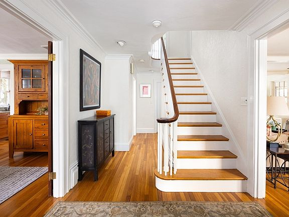 In a perfect Newton Centre location under a half mile to the village/T, this updated home sits at the end of a cul-de-sac and directly abuts Webster Woods. It offers a direct entry garage, central AC and a beautifully landscaped 16,670 square foot lot. The main level has a spacious living room with a fireplace, sliders to the back patio and access to the 3 season porch, perfect for coffee or cocktails. Across the foyer is a nice dining room that leads to the sun-filled kitchen with a breakfast area, granite counters and stainless appliances, plus access to the patio with a serene waterfall feature. A powder room completes this level. On the 2nd floor is the primary suite with a large bedroom, a dressing room and en suite bathroom, plus 2 more nice bedrooms & the 2nd full bathroom. The third level has two more bedrooms, one currently used as a family room, and the 3rd full bathroom. Partially finished, the lower level has a bonus room, storage, laundry and door to the garage.