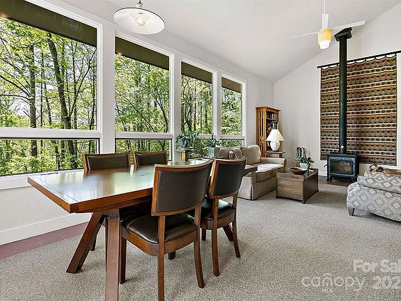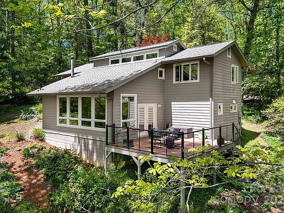 Welcome to an architect-designed modern home on a private 2-acre setting adjoining the beautiful Warren Wilson College Campus, with its miles of hiking trails, rolling fields and amazing views. Situated on a private cul-de-sac, the home features 3 bedrooms and 2 baths and is convenient to I 40, Asheville and Black Mountain. The one-owner home, a first-time rental, is well maintained and features a soaring living room ceiling allowing natural light to brighten and warm this passive solar house. The downstairs windows offer a panoramic view of undeveloped forest. The dining area opens onto a spacious deck. Both the deck and front porch offer lovely views. The kitchen has its own pantry. The upstairs features two ensuite bedrooms (one with a private deck) plus a third bedroom or studio. A bonus room downstairs features poplar paneling and oak and cherry trim. Renovated kitchen and downstairs bathroom, new oak flooring and updated tile bathrooms upstairs. The yard features an acre of lawn and plantings surrounded by an acre of woods. Appliances include stove, refrigerator, dishwasher, washer and dryer. New heat pump plus soapstone woodstove. Newly pumped and flushed septic system. The home could come partially furnished if desired. No smoking. 2 pets total.