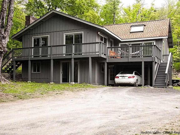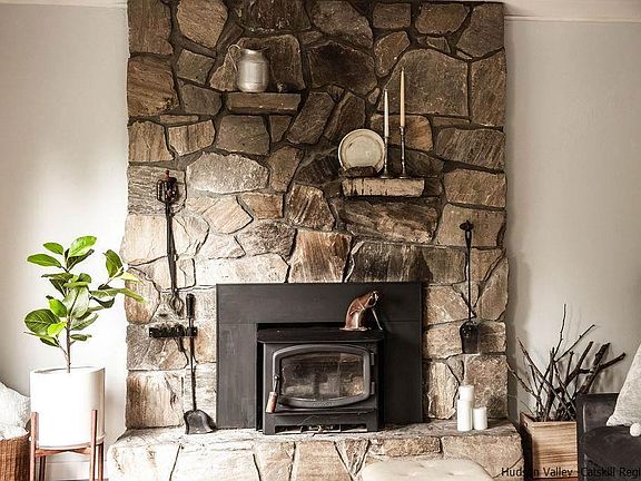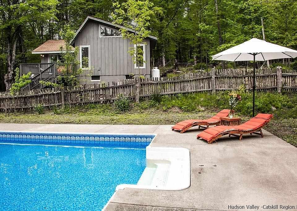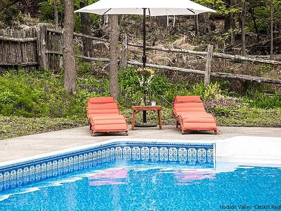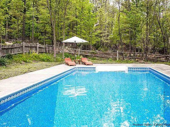Summer Rental for June: Rustic feel combined with touches of glam produce this recently renovated lodge home! Tucked away on 3.84 acres just 5 minutes from the main street in Woodstock is a magical little mountain home with a stunning pool. This home features a gorgeous renovated kitchen, complete with Taj Mahal Quartzite countertops and stainless steel Whirlpool appliances. Additionally it opens up directly into a dining room, which has perfect flow for entertaining. The dining room features large windows of the surrounding forest, is abundant with natural light and has a gorgeous deck that leads off it. Feel free to take in a meal al fresco or enjoy an evening cocktail! On the other side of the kitchen the open floor plan leads you to an enormous living room with ample seating. This room features stunning original wood beams on the ceiling and a gorgeous riverstone fireplace. The oak wood floors add the perfect finishing touch throughout. Also located on the same top floor, in the canopy of trees, is a serene master bedroom suite. The master bedroom features a vaulted ceiling also with original wood beams, exquisite pool views and direct access to the deck with a hammock for relaxation. Lastly, the master bathroom also features a jacuzzi tub should you choose to soak after a long day of hiking or swimming. As if all that isn't enough there is still a full lower level which houses two more bedrooms and a TV den that can easily be converted easily into a third bedroom. The lower level also includes a retro chic bathroom, a laundry room (complete with a brand new washer and dryer) extra storage space and a one car garage. There is access directly to the outside and pool area from that floor as well. Whether you are relaxing in the hammock or grilling out, all three decks are a perfect place to to enjoy and take in nature. Every room features lush green views of the surrounding trees and landscape. Between the private pond on the property and the total privacy, it is everything you are looking for in your perfect Woodstock summer escape. Deer and other wildlife are spotted meandering through regularly as well. This rental comes fully furnished with pots, pans, dishware, flatware, towels and linens all included. High speed internet, cell service and central air. All utilities are included as well as trash pick up, and weekly pool servicing. This short term rental is available starting immediately and for the month of June. It is a 30 night's stay for $9000 for the month. This rental is also available for a full year starting October 1st. OPEN HOUSE THIS SATURDAY, MAY 22ND FROM 3-5 PM