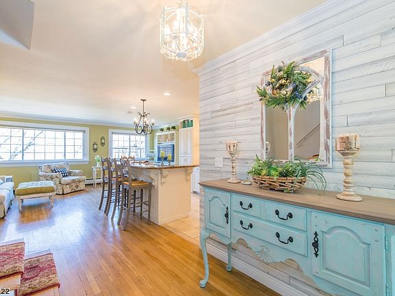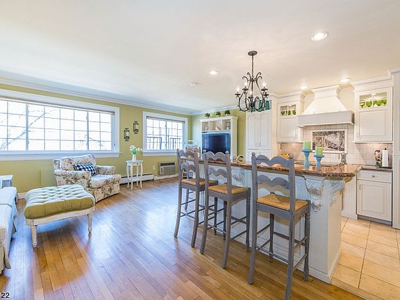 Walk up to a beautifully updated open-concept level with wood floors, bright windows, recessed lighting and crown molding throughout. Entertain from kitchen with granite counters, stainless and cabinet front appliances, island with breakfast bar, sink and dishwasher - all open to living room with views. A formal dining room, updated half-bath and pantry round out the floor. Upstairs is a spacious master bedroom with gorgeous sky-lighted bath and tucked away washer-dryer. The two other bedrooms share a designer bath with skylight. First level 2-bedroom apartment has wood floors and lovely details. Basement is fully finished with mud room, full bath, washer-dryer, and walkout to fenced in backyard. Built-in garage. Enjoy Bayonne with parks, shops, new Costco, and planned ferry to Manhattan!