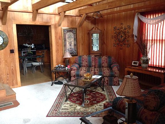 Very rustic home with vaulted living room and wooden beams Large stone fireplace with insert Huge utility room with loads of storage Nice office overlooking living area Big den with french doors and sliding glass doors opening onto deck Located near downtown shopping and eateries and within walking distance to Bethel University