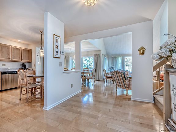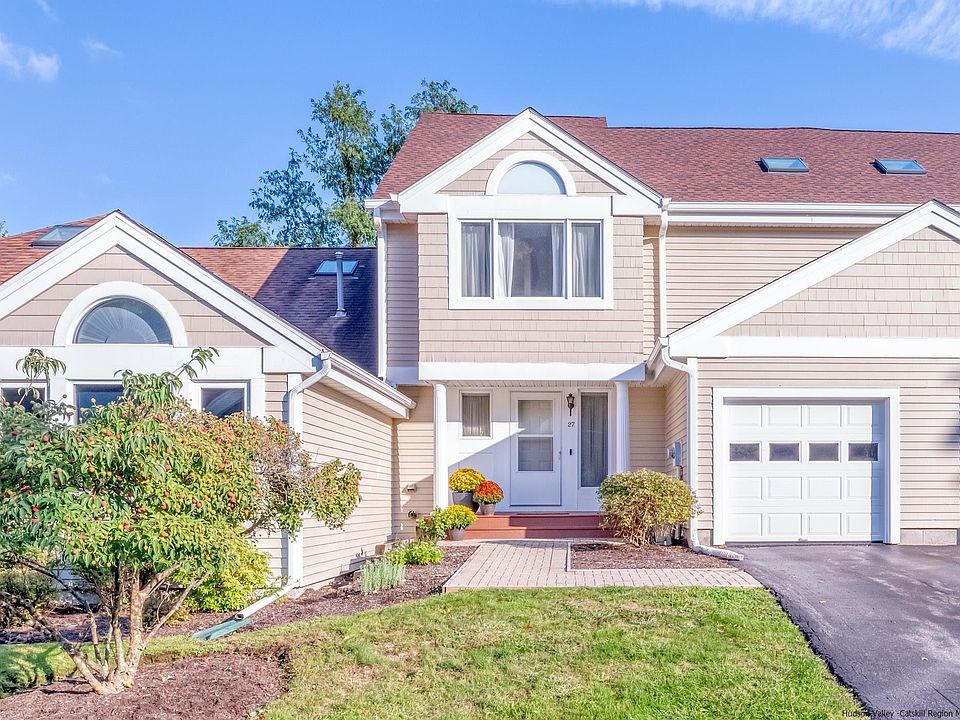 OPEN HOUSE, Sunday 10/1, 12 to 2:00 PM. Like new, this charming and meticulously maintained townhouse, conveniently located minutes to the historic Uptown Kingston District with restaurants, shops and farmers market. The sunny foyer opens to the light filled spacious living room which features 20' wood ceilings, cozy marble surround gas fireplace, gleaming hardwood floors and sliding glass doors that lead to the deck overlooking the wooded backyard. The custom kitchen which is open to both the dining area and living room, offers quartz counters, wood floors and s/s appliances. Upstairs you will find the luxurious primary bedroom with vaulted ceiling, two walkin closets and updated master bath with double sinks, quartz counters, large tub and separate shower. Second bedroom also has its own full bath.The sizeable finished walkout lower level has a large family room with glass sliders to the stone patio, 12 x 12 office and additional closet space. The custom furniture can remain if buyer desires. Many updates including new roof, gutters and skylights, new furnace, air conditioning, hot water heater, sliding glass doors and garage door. The $290.00 HOA fee includes landscaping, lawn maintenance, snow removal, trash pick up, pool and tennis. Come live the good life!