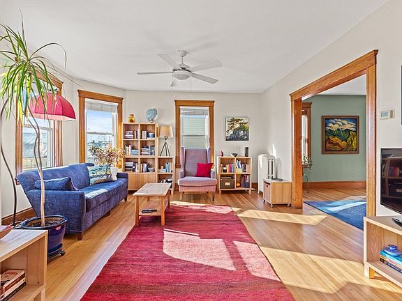 Enjoy this sun-soaked and spacious top-floor condo, quietly nestled on a tree-lined street in Teele Square, West Somerville. The floor-through layout with a welcoming foyer is an ideal setting for relaxed get-togethers. Let natural light fill the space through the five living room windows as you enter the traditional dining room, featuring hardwood floors, a built-in cabinet, and a touch of natural woodwork. The adjacent renovated kitchen has practical granite counters, stainless appliances, and a convenient pantry. Discover a king-size primary bedroom, an updated bath with new vanity, and a roomy second bedroom for your comfort. Embrace the outdoors on the front covered porch with mahogany decking or the versatile back porch. Added conveniences include a front hall closet, basement storage with a washer/dryer, one-car tandem parking, and shared outdoor space. New ceiling fans, fresh paint throughout, new roof, gutters, painted trim & more! Easy access to Davis Square, Routes 2/16/93.