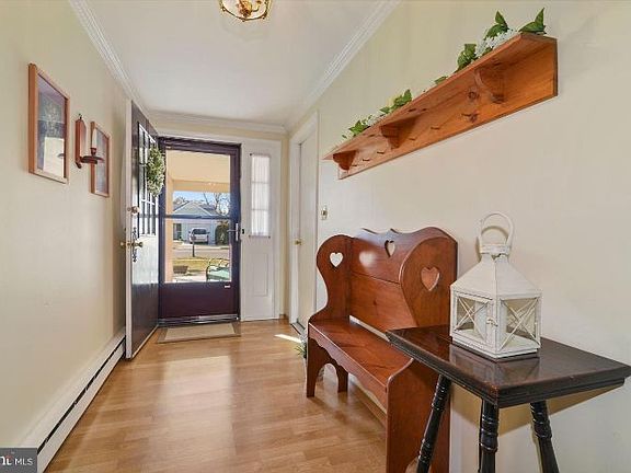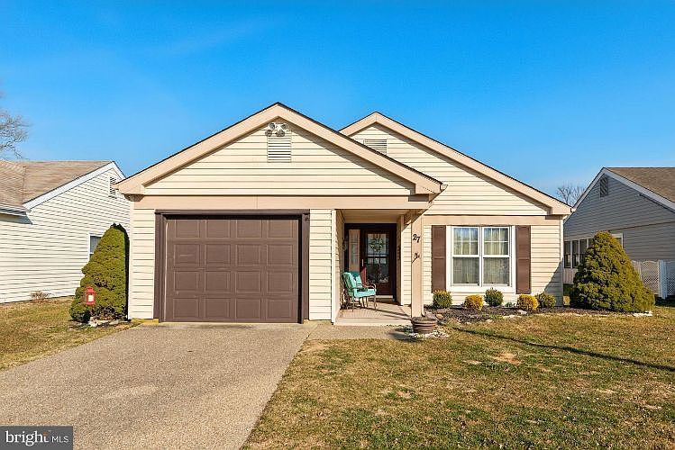 Wonderful opportunity in desirable Leisuretowne! Two bedroom, two bath Heather model is deceivingly spacious. Lovely front porch entry into a bright and sunny foyer with crown molding, coat closet and easy maintenance wood laminate flooring. Foyer leads to a very open and spacious living and dining room combination, wonderful for entertaining! Dining room has a lovely newer chandelier, crown molding and two double hung windows (windows throughout are vinyl replacement windows). Living room also with crown molding, ceiling fan, Andersen slider and three double hung corner windows that bring in lots of natural light. Neutral eat-in kitchen, with an open view to the dining room, features plenty of cabinetry including a corner lazy susan, crown molding, smooth top range, built-in microwave, brand new pull out faucet, disposal, dishwasher, ceiling fan, tile backsplash, refrigerator with bottom freezer drawer and a steel side door. Large master suite with double door entry includes three double hung corner windows, a walk-in closet plus dressing area . Full bath with stall shower has a hand held shower and window for both ventilation and natural light. Second bedroom with two double hung windows and an extra large double sliding closet has separate full bath access with tub and hand held shower. Laundry room with plenty of shelf storage. A washer (newer) and dryer both remain. Additional features include an aggregate concrete driveway, lawn sprinkler system, maintenance free vinyl siding, motion spotlights at the driveway, roof approximately 9 years old, storm door and a one car garage with opener and direct access to the front foyer. Leisuretowne is a 55+ active adult community surrounded by woods, parks and beautiful lakes. There are pools, tennis courts, a gym, putting green, bocce and shuffleboard courts, billiard rooms, libraries plus numerous clubs and activities. A wonderful place to call home!