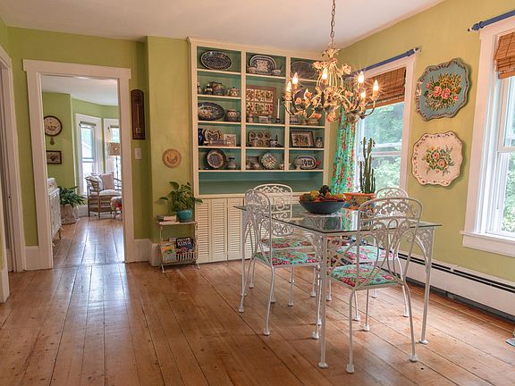 The spacious dining room features custom built-ins and a cozy wood-burning stove, while the eat-in kitchen offers ample cabinet space and a charming breakfast nook perfect for morning coffee or relaxed evening meals. Two full, renovated bathrooms—one on each floor—add modern convenience.