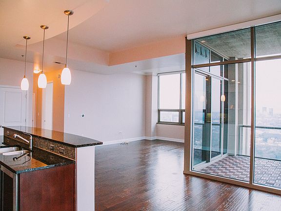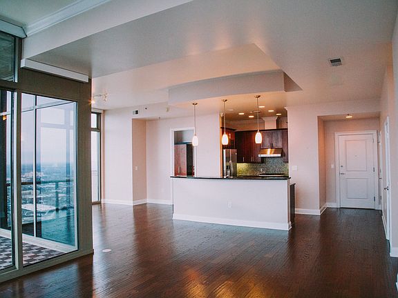 AMAZING 43RD FLOOR CORNER UNIT W/ STUNNING VIEWS OF DOWNTOWN, MIDTOWN & WEST MIDTOWN! This rare upper floor unit features a chef's kit w/SS appls, gas cooktop & granite. Beautiful h'wood floors, lg Living/Dining Rm lead out to large covered balcony. Master BR features walk-in closet w/ built-ins & spa-like bath. 2nd BR boasts b'ful full bath & private balcony. The building features a club room w/ game room, library, DR & wine cellar, state of the art gym, pool/hot tub & conference room. Enjoy hotel-esque amenities & all that Atlantic Station has to offer!