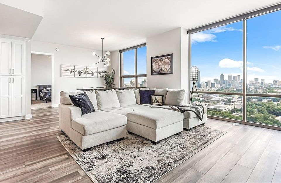 Step into the life of luxury in this beautifully updated home with sweeping views of the Atlanta skyline. This 2 bed, 2 1/2 bath has a desired floor plan featuring split bedrooms, each with their own en-suite, plus open living-kitchen area perfect for entertaining. The extra large, spa-like primary bath, complete with soaking tub, is a dream. Floor to ceiling windows in the living area show off the best view in the city, and fill the space with natural light. Your windows will come with elegant motorized blinds, able to easily be controlled via remote, your phone, and Alexa. Blackout shades are in both bedrooms to ensure a cozy sleeping atmosphere. Extra den/office space resides off the kitchen area, complete with beautiful custom bookshelves and exquisite, high-end wallpaper, perfect for working from home or curling up with a good book. Custom shelves continue in both closets, adding a designer look and excellent ease of organization. Picture yourself relaxing on the balcony, taking in the view, with your morning coffee, or the AMAZING sunset with a glass of wine. It cannot be beat!