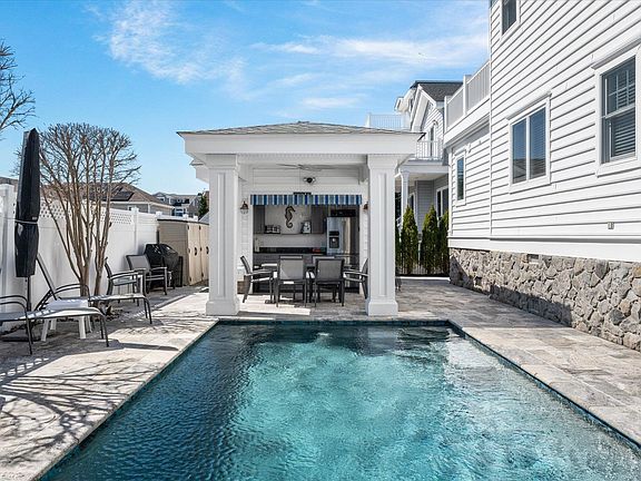 Positioned on an oversized 60’ x 110’ lot, this stately Avalon residence offers striking interior and exterior architectural elements, substantial interior and exterior living space, a new kitchen, high quality finishes, a southern-exposed saltwater pool, cabana, a first floor family room, 6 bedrooms, and 4.5 bathrooms. This home commands attention from the the sidewalk with three dormer windows incorporated into the roofline, privacy fencing, mature and well-maintained landscaping with irrigation system and lighting, beautiful awning-covered deck and porch spaces, and a paver-accented driveway that leads to a grand covered entryway, accessible via two independent staircases. The backyard pool area is surrounded by beautiful travertine stone, landscaping beds, and a 7 foot fence for added privacy. A deep cabana offers ample cabinet space, a full-sized refrigerator, and extends to shade a relaxing dining area at the water’s edge. The street facing side of the cabana building includes a separate garage door entry where the pool equipment is stored away from the elements and also offers plenty of storage space for your bikes and beach gear. Enjoy the sun, swim, or lounge poolside in your backyard oasis. Entering the first floor, you are welcomed by 9 foot ceilings, a grand center staircase, and a first floor family room to your left. This comfortable space is outfitted with one of two gas fireplaces and gives access through a sliding door to the covered front porch. There are 5 bedrooms on the first floor, along with three full bathrooms, one of them being an ensuite. A spacious laundry room is also tucked away on the first floor, outfitted with built in cabinetry and a full sink. Another side entry door gives access to the yard area from this room. The second level offers even higher, cathedral ceilings, an expansive living and dining area, kitchen, powder room, and the primary bedroom suite. Behind the dormer windows are three light fixtures, that together with the cathedral ceilings create an impressive and elegant interior living space. The dining room and kitchen offer abundant seating for summer gatherings with table and island counter seating. The new kitchen was beautifully crafted and includes two-toned cabinetry, a Thermador appliance package, and is anchored by a distinctive custom wooden hood vent that extends all the way to the ceiling. Three sets of sliding doors bring in more natural light to this space and give access to the retractable-awning-covered front deck, equipped with a gas-line for easy summer grilling. The living room offers another gas fireplace with plenty of room for entertainment or relaxation and flows seamlessly with the kitchen and dining areas. A convenient powder room and added storage space are located down the hallway on the way to the primary bedroom suite. This expansive bedroom includes cathedral ceilings, outstanding closet space, built in cabinetry, and a private bathroom with double vanity sinks and a walk-in shower. Another awning covered deck is accessible from the primary suite, offering summer breezes and a vantage point of of the beautiful exterior grounds and surrounding residential neighborhood. Additional recent updates include a new roof in 2020 and new HVAC system three years ago. While never offered for rent by these original owners, this home could serve as an excellent rental investment property considering its 6 bedroom nature, ideal location within walking distance to the business district, and the inclusion of a swimming pool - three of the most commonly requested features by tenants seeking a summer vacation rental. Opportunities to acquire a property in Avalon of this value, size, location, and level of quality are rarely brought to market. Offered furnished less a small exclusions list. Contact agent for appointment.