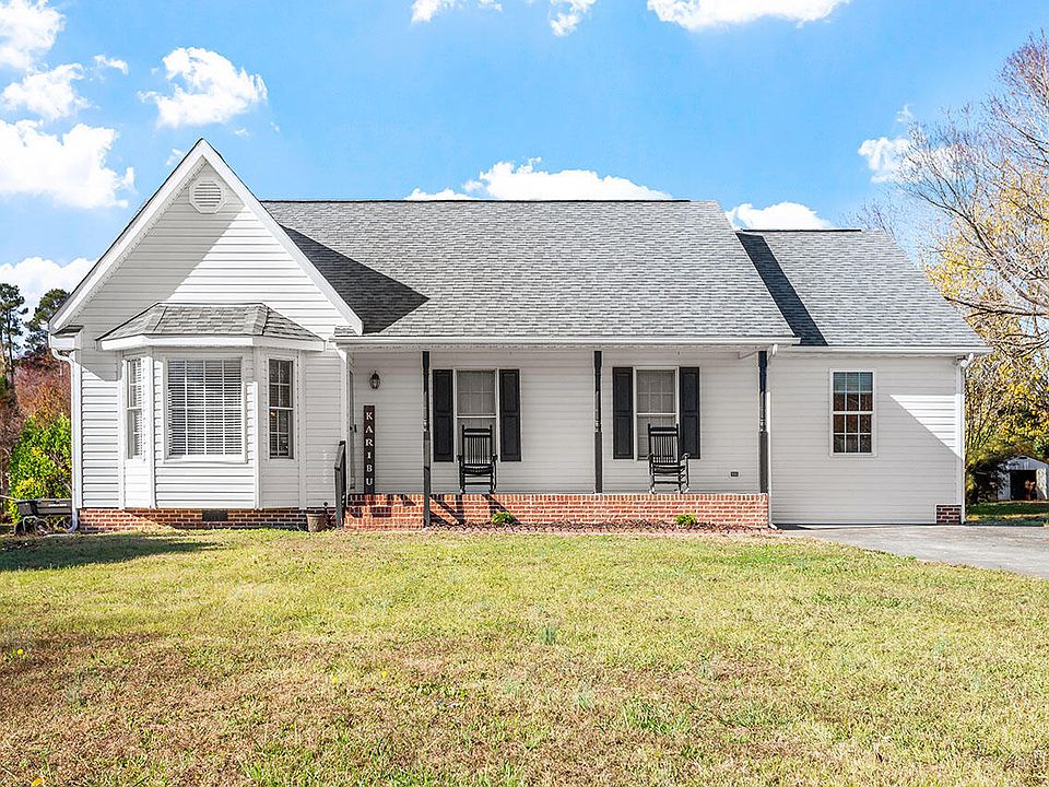Charming ranch style home situated on just under an acre. Home features fresh paint, lvp in main living area and fresh carpet in bedrooms. Open family room, eat in kitchen with dining, primary suite, (2) secondary bedrooms, hall bath and bonus space. Additional features include; rocking chair front porch, covered back porch and garden area.