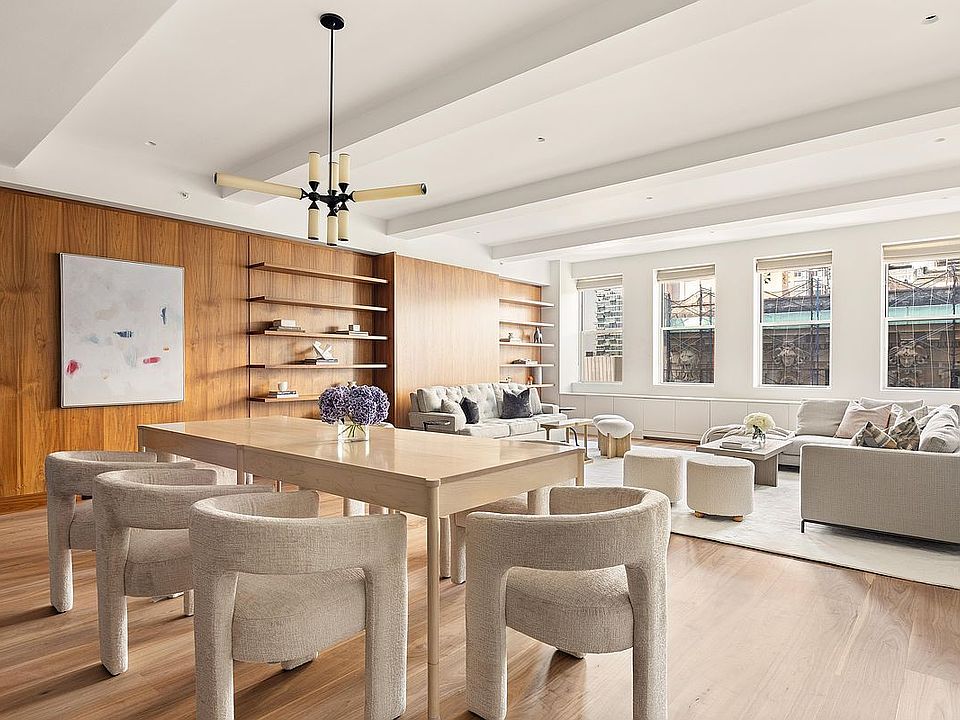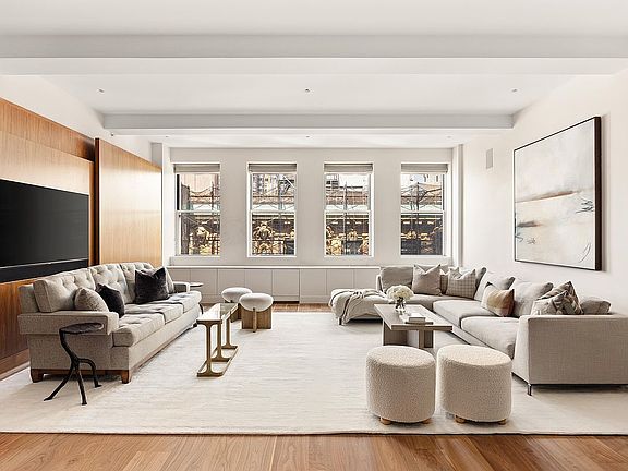 Set within a beautifully restored pre-war, Art Deco tower, this meticulously designed residence combines historic charm with sophisticated modern finishes. A gracious, oversized entry foyer welcomes you into the home and flows seamlessly into the expansive great room. Spanning over 40 feet, the living and dining area is bathed in natural light from a wall of oversized windows that frame skyline and Hudson River vistas. The custom Poliform chef's kitchen is a study in form and function, featuring custom walnut cabinetry, Miele and Sub-Zero appliances, and ample prep and storage space to accommodate everything from quiet meals at home to large-scale dinner parties.