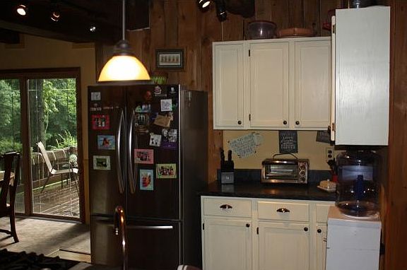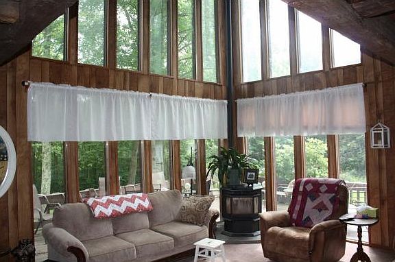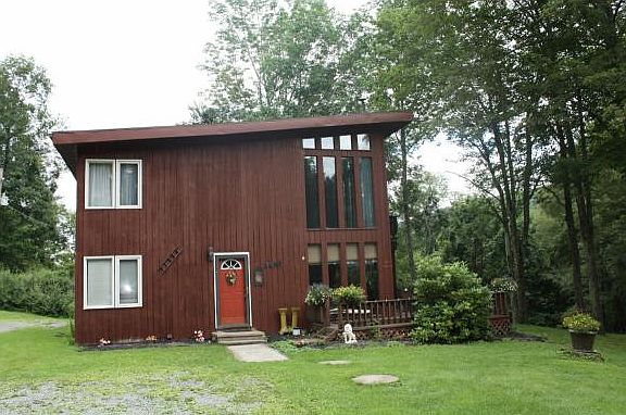 Cedar sided Contemporary nestled in the woods on the edge of Pa.boardering N.Y.S.Vaulted ceilings,exposed native wood beams,w/w carpet & laminate flrs,2 pellet stoves,newer appliances.2nd flr. balcony looks over 2sty windowed wall in lvrm.Fully appl modern kit.opens to Din/rm & den.Both have sliding glass drs to decks.2c det.gar w/2nd flr.Above ground pool with decking,ld/up stone Coy pond/gardens