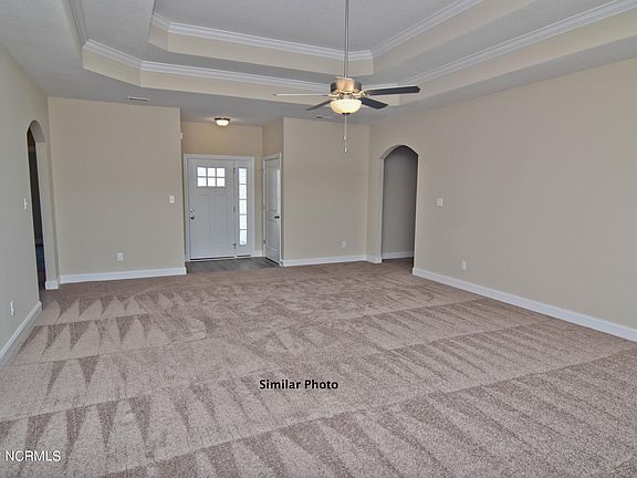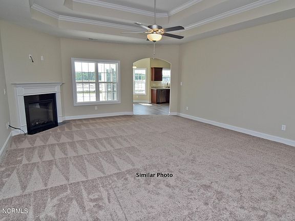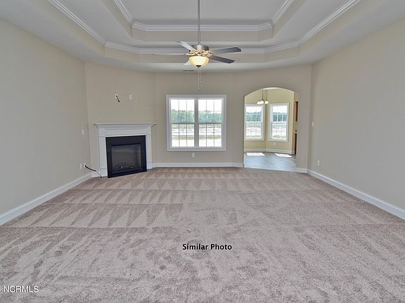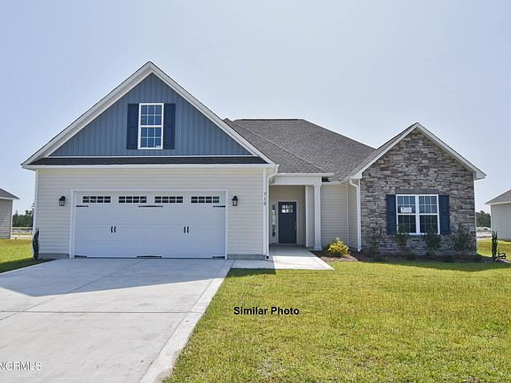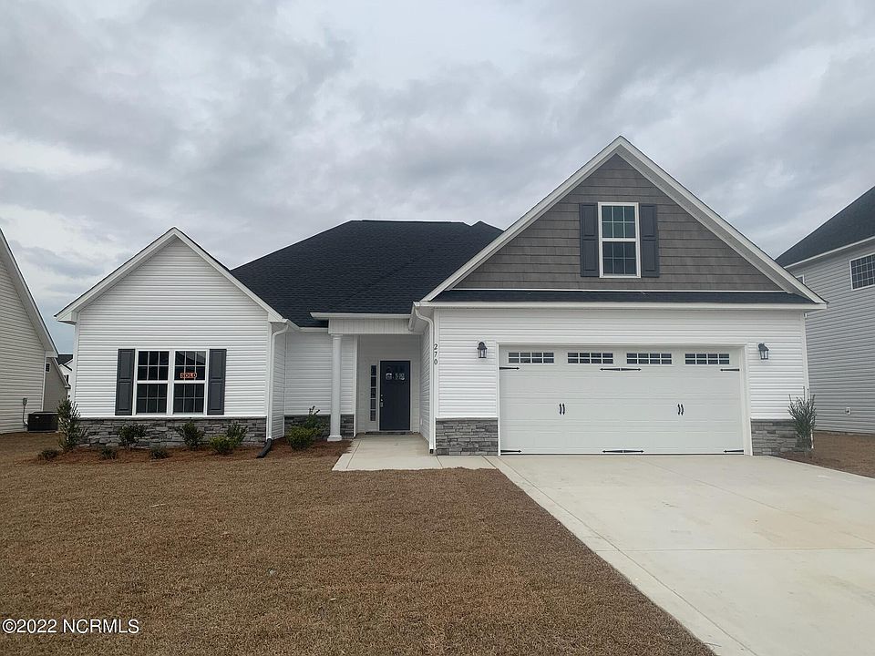 Welcome to the highly desired & popular community of Onslow Bay. Brand new construction built by Onslow County's most trusted & preferred builder, featured in Builder 100/ Top 200 Builders in the country. Onslow Bay is a hot spot, 3 miles to MCB Camp Lejeune's Piney Green gate, 14 miles to New River Air Station & minutes to area schools, shopping & dining. This beautiful neighborhood is sure to impress, complete with a clubhouse area & community pool. The Raegan 2378 is a Sydes exclusive floor plan, 2378 heated square feet, split floor plan with 3 bedrooms and 2 bathrooms. A quaint front porch welcomes you home into a magnificent 18x25 family room with a cozy corner fireplace. The master suite will feel like a private retreat, 18x15 with dual closets and a luxurious master bathroom. The master bath is a spacious 11x13 with double vanity, separate shower, and soaking tub. The kitchen is sure to impress with beautiful flat panel, staggered cabinets, and stainless-steel appliances to include smooth top range, dishwasher, and microwave. Eat-in kitchen is open to a 9x12 dining area. Bedrooms two and three have ideal walk-in closets. The 12x26 bonus room is a great space to use as a playroom or home office. 2-car garage and a covered back porch. Call today. Floor plan renderings are similar and solely representational. Measurements, elevations, and specs may vary in final construction. All selections have been ordered, limited selections for buyer to choose. Call L/A to verify.