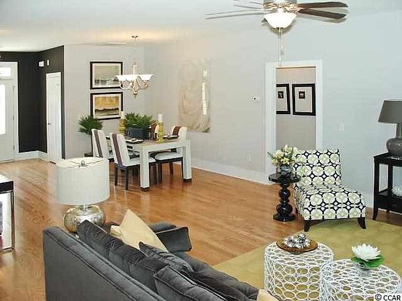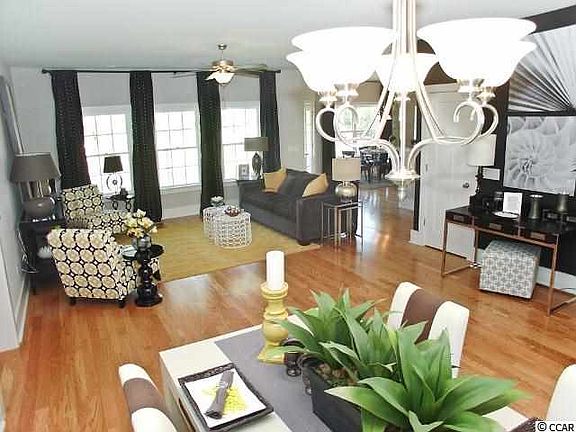 Open plan with 2467sq. ft. 1.5 level home with 9' smooth ceilings down, 8 ' ceilings upstairs. Bull nose corners and archways throughout for a softer effect. Kitchen has granite counters, SST appliances. Range is natural gas. Walk in pantry. Cabinetry is 36" birch. Flooring has tile in wet areas, Hardwood floors in the dining room and great room and carpet in the bedrooms and bonus room. Natural gas fireplace and tank less gas water heater. Finished 2 car garage. Water view. Full landscaping and irrigation. Convenient Carolina Forest community with pool & amenity center. Pictures are representation. . Subject to ARB approval.