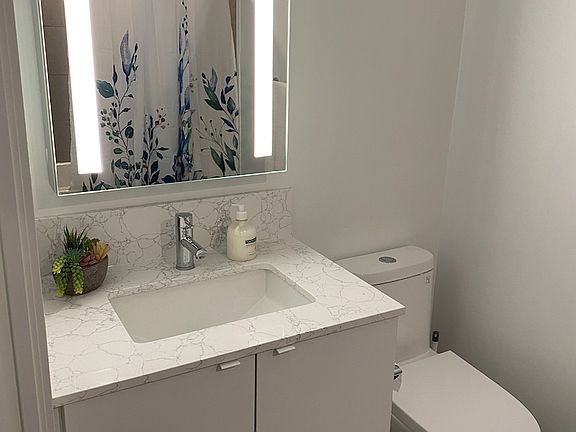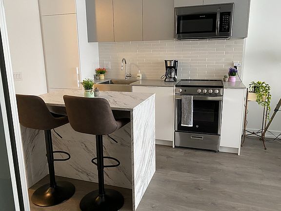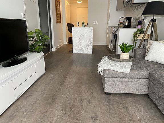 Occupancy for the furnished 613 sq-ft 2-bed, 1-bath unit. Water/heat/hydro included. Included modern appliances: fridge, dishwasher, stove, microwave, washer, and dryer. Central AC and heating. Well-trained pets are welcome. Minimum 6-month term required. Building amenities include: fitness facility, yoga room, party room, pet spa, movie room, BBQ, bike storage.