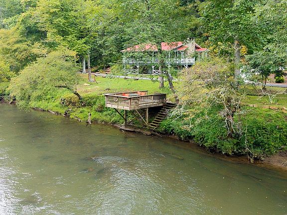 Nestled along approximately 420 feet of pristine Hiawassee River, this charming 2-bedroom, 2-bathroom riverfront retreat offers the perfect blend of modern luxury and natural serenity. Fully remolded from 2021 to 2024, this home is a haven for those seeking a peaceful escape or a lucrative vacation rental opportunity, conveniently located just minutes from the vibrant towns of Murphy and Hayesville. It has been thoughtfully updated with new plumbing, electrical wiring, a durable metal roof, central air conditioning, water heater, and new appliances for worry-free living. Its open floor plan features a striking large rock fireplace, perfect for cozy evenings, and a luxurious master bathroom with a tile walk-in shower. Relax on the expansive covered porch, complete with 3 lighted ceiling fans and recessed lighting, or savor your morning coffee on the new dock overhanging the tranquil Hiawassee River, where bald eagles soar overhead. A new oversized circular driveway provides ample parking, while the partial walk-in crawl space with a concrete floor, vapor barrier, lights, power and floor joist insulation offers convenient storage. Just minutes from Murphy and Hayesville, enjoy easy access to local amenities while being immersed in the soothing sounds of the flowing river and the beauty of Mother Nature.