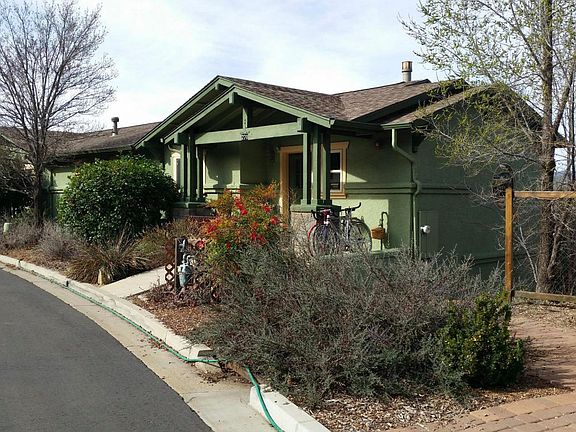 This home has amazing views of Prescott, including sunsets over Thumb Butte, lush landscaping, and friendly neighbors. It is a craftsman home in a Eco-friendly neighborhood, Manzanita Village a Co-Housing community. You can enjoy rural lifestyle with just a short walk to downtown Prescott using trails from your own backyard. Enormous jetted jacuzzi downstairs, very warm fireplace for cold snowy nights, and a completely remodeled kitchen! Three story community center has shared space great for entertaining guests for the day or overnight, relaxing in hot tub, or getting a workout in the gym. Organic food is grown on the premises and is shared along with community dinners, games nights and other wonderful activities. Parking is located around its perimeter which makes for a nice quiet community for pets and people. This is a multi-aged village, perfect for raising children. The home features beautiful Thumb Butte views, a heated Arizona room, and electric metal shades on the windows in the AZ room.