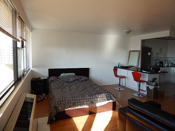 Renovated large open layout studio w balcony. Wood floors, granite countertops, stainless steel appliances. Walk-in closet. 24-hr doorman bldg. Laundry and gym on premiese. Parking extra. Rent includes all utiliites (heat, h/w, gas and electricity). Across PATH-Grove, steps to light rail, ferry, shops, grocery, etc.
