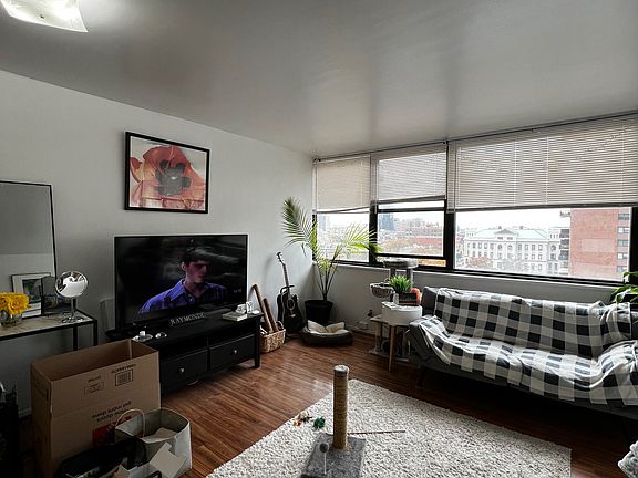 Large Studio Facing west Open layout with Great views of Downtown JC separate kitchen with SS stove and fridge Large separate full bath and changing room wit h great closet space! Rent includes Heat, AC, gas and electric Onsite card op laundry Onsite Parking for $200 per month 1 year lease