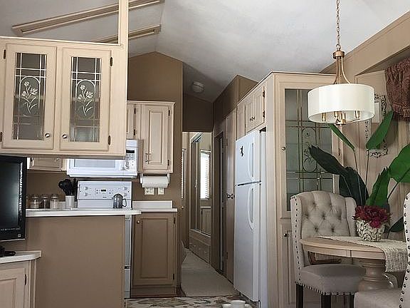 Bright and fresh 1997 Cavco 1BR 1 bath in great location of 55+ park. Immaculate clean and move in ready with new designer furniture and newly painted inside and out with new laminated wood flooring throughout. Central A/C and heat. Second sleep area with sofa bed and separate entrance. Large laundry and storage. Tiled fenced patio with grass turf. Nice kitchen with LOTS of storage and pantry full of needed appliances handy! Pots, pans, dishes , ,silverware knives - everything is here and ready for your new summer home. Must see this one. Call (480 )689-7611 for more information.