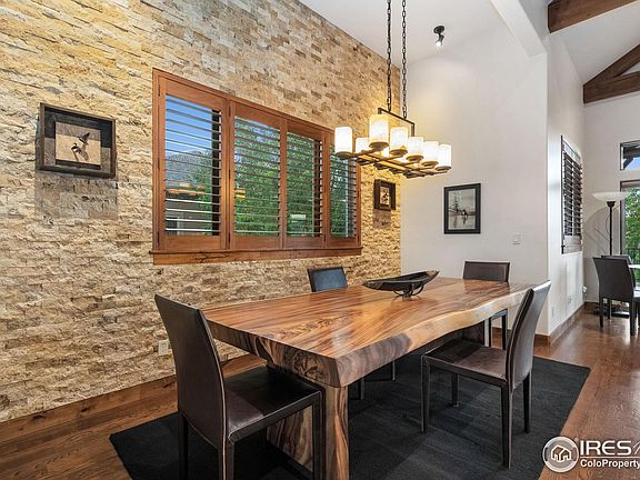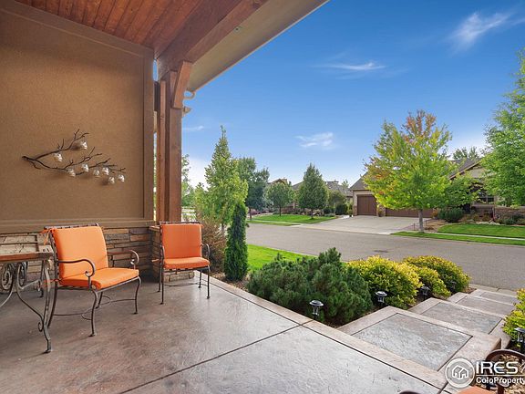 This beautifully crafted 4-bedroom home blends timeless architecture with high-end finishes. A covered front porch is ideal to enjoy mountain views. The floor-to-ceiling dual-sided stone fireplace separates the living rm from the spacious kitchen + dining areas. The gourmet kitchen features Thermador appliances, including a 5-burner range, convection oven, microwave, and refrigerator, with a tall eating bar ideal for casual dining +easy access to covered deck w auto shade. The primary suite offers spa-like amenities w/ dual glass vessel sinks, backlit mirrors, and walk-in closet. Additional main-level office / TV room adds flexibility, while laundry area has custom cabinetry, sink, +closet. Beautiful steel rod railing leads to walkout lower level w/ 3 bedrooms, full bath, family room w/wet bar, a workout area, + extra storage. One bedroom includes a built-in Murphy bed. The side-entry heated two-car garage offers bonus space currently used as a rec/sports area, with potential for a third bay or studio... 265 sq ft. Lot backs to private open space, but close to trails and Boedecker Lake. New carpet + paint and some lighting in lower level, new Lennox furnace installed 2024, new smoke alarms, radon mitigation complete, Pre-inspected and 5 year Roof Cert in place