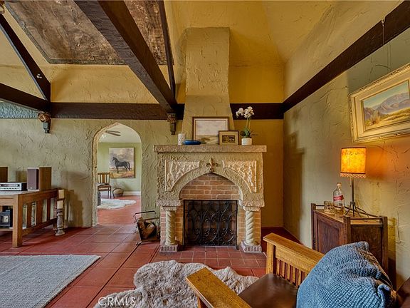 This property presents a rare and compelling opportunity to acquire a residence of significant historical and artistic provenance. Built in 1904 by Frederick Melville Dumond, a distinguished artist and architectural student, this home, known as "Chateau des Reves," embodies a unique blend of European artistic influence and Southern California charm. The architectural design features a French roofline, evoking the medieval homes of Normandy. The interior spaces are characterized by whimsical details and artistic expressions, notably the living room's beamed ceilings adorned with "eavesdroppers" and a fireplace featuring hand-crafted religious scenes and a mural of "Old King Cole." Large, north-facing windows offer panoramic views of the San Gabriel Mountains, while a Moroccan door leads to a den or office space.The formal dining room continues the artistic theme with "eavesdroppers" depicting Guinevere and Lancelot, and an original stained glass window in the stairwell, complemented by historical "arrow guards." The kitchen, located at the rear of the house, opens to a lush garden, abundant with fruit and vegetables. The main floor includes a bedroom with a charming, hinged castle door, and concrete flooring that naturally regulates temperature. The upper level houses a bedroom, bathroom and finished attic (potential 3rd bedroom). Renovations include replacing the firebox and liner in the fireplace, installing copper gutters, a tankless water heater, and a mini-split system in the dining room. Original pilaster lights and replicated exterior fascia boards with trefoil details enhance the property's architectural character. The property includes a detached garage, two covered patios, and multiple intimate outdoor entertaining areas.The expansive backyard is a flourishing orchard, featuring a variety of fruit trees, including avocados, tangerines, limes, lemons, grapefruit, and mandarin oranges. The garden is further enriched by a grape vine, raspberry bushes, and a diverse array of flowering plants, such as star jasmine, pink jasmine, wisteria, crepe myrtles, and roses. A commitment to natural gardening practices ensures a thriving ecosystem, attracting butterflies, bees, and hummingbirds. The property is a sanctuary for nature enthusiasts, with numerous nesting birds and a tranquil atmosphere. The presence of an active fountain further enhances the environment, creating a haven for local wildlife.