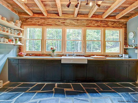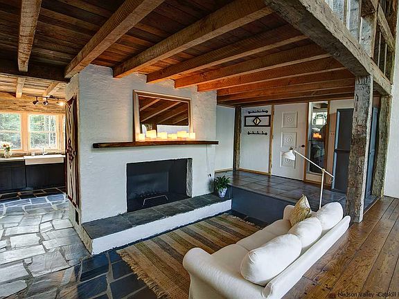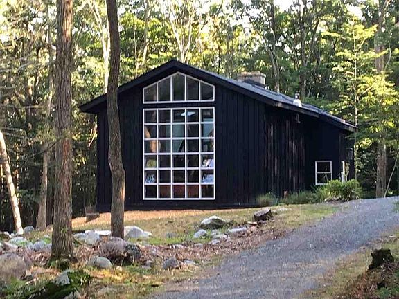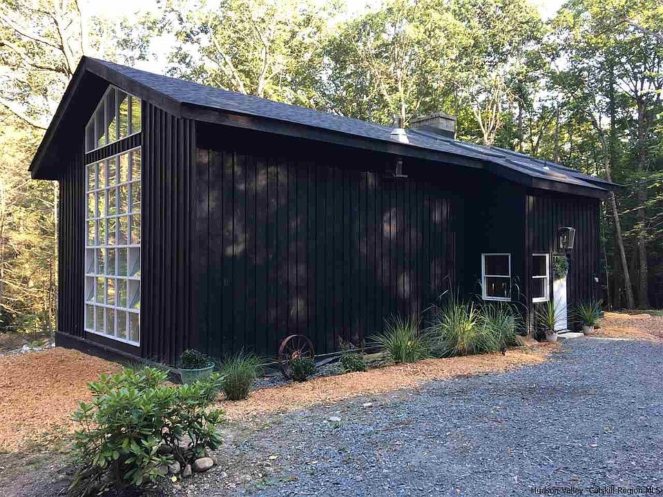 A jaw-dropping modern contemporary home made from reclaimed barn wood 75 miles from NYC. Entering the tree-lined private driveway along the Plattekill Creek, you'll be greeted by the massive wall of windows built by the original owner, a sculptor who created a living room with 19-foot ceilings. Completely renovated last year by the sculptor's niece, the manager of a luxury hotel property, this home ticks all the boxes for a perfect weekend or full-time residence: utterly unique charm, incredible views (including skylights in every single room upstairs!), and privacy without isolation. Practical/luxurious details of country life have been considered here with a slate-floored mudroom, wood-burning fireplaces in the den and master bedroom, an incredible freestanding antique wood stove from the original Pine Bush train station, and plenty of areas for entertaining or relaxing. Quiet and peace pervade the area. Next door is Thich Nhat Hanh's Blue Cliff Monastery. 5 miles to Sam's Point hiking and about the same to the center of the hamlet of Pine Bush with its health food store, vegan Chinese restaurant, and other amenities -- and slightly longer but absolutely stunning drives to Stone Ridge, High Falls, Rosendale, Kerhonkson, Accord, Gardiner, Ellenville, New Paltz...and all the farmstands, restaurants, cafes, hiking, wineries, distilleries, galleries, and more in this very special region. The Plattekill Creek runs beside the house and is strong enough to be heard inside during the spring and summer months. This is one of those places where it's very easy to imagine waking up in the master bedroom and stepping outside to enjoy a cup of coffee on your balcony (overlooking the creek!) or maybe taking a soak in the extra-deep bathtub before starting the day. Updates from the past two years include a new roof, water softener and UV light, on demand water heater, and additional insulation. New drilled well from 2006. The house stays cool in the summer from the shade and primarily north-facing windows -- and keeps cozy in winter with its many skylights and wind-protected location nestled into the small valley next to the creek. Every one of the windows in the living room has been replaced with double-paned glass last year and six of them are operable to allow for a nice breeze. There's a new fridge in the kitchen and the Montague Grizzly commercial stove has a lifetime warranty. Spectrum serves the area for (very!) high speed internet and cable. Roof was redone in 2016.