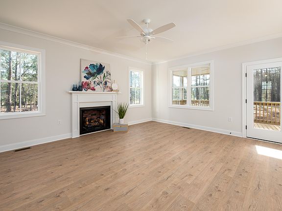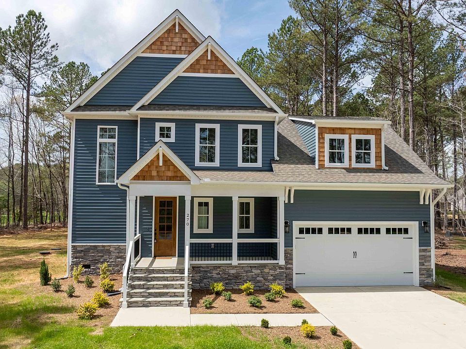 This farmhouse has board & batten siding with stone and Cedar Shake accents. The first-floor master suite includes a bath with a walk-in shower and closet. The open kitchen and family room feature a gas log fireplace, island with pendant lighting, bar seating, and walk-in pantry. A mudroom connects to the 2-car garage. Upstairs are a Game room and bonus room, two bedrooms with walk-in closets, and a shared bath with double vanities. A screen porch on the rear leads to the backyard.