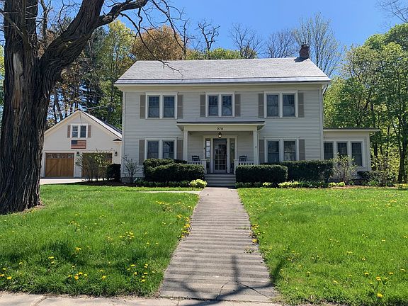 This modern Colonial is a must-see property. Classic 1900s center hall layout featuring 4 bedrooms, 5 baths, a large kitchen, living room, dining room and sunroom. A 2018 renovation added a Great Room, fireplace, marble-topped bar, mudroom, bonus storage room, and a 3-car insulated/heated garage. Large corner lot in the city with a private backyard. Extensive stonework, designed landscaping, and a circular driveway with plenty of room for vehicles. Convenient downtown location. Owner pays for water. Renter is responsible for gas and electric. No smoking allowed. 1 year lease preferred.