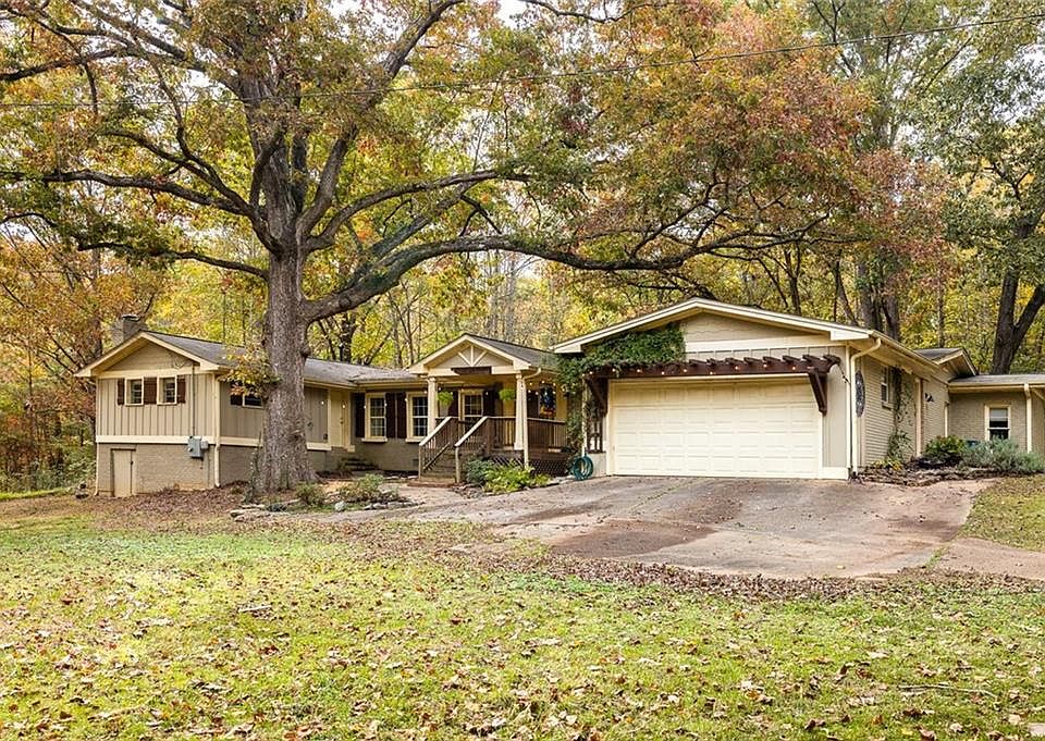 Dreaming of a quiet home in the woods with lots of space for living, working, creating, tinkering, or just doing your thing? This 5 bedroom, 4 bath ranch home on a tucked away culdesac finds the perfect combination of a cozy, open floor plan while still offering abundant separate bedrooms and flex space for when you want quiet privacy. Despite the established neighborhood, this house sits on a small side road with with only one nearby neighbor, and no HOA, giving a rare sense of warm solitude, while just 20 minutes from Downtown Atlanta or 25 minutes from the Airport and The Battery. The front porch entry leads into a large living room with a central fireplace which separates it from the spacious eat-in kitchen. The adjacent dining room is separated from the living room and hallway by two half walls. Just off the kitchen are a full bathroom and laundry room with storage. The left wing of the home holds the primary bedroom with ensuite bathroom, two additional bedroom and one hall bathroom, plus a large room with a fireplace and exterior door that could be a den, playroom, music/art space, or primary bedroom. On the right wing of the house you'll love the oversized two car garage, with stone steps and a terrace level that could be used for a workbench or mudroom staging area. Just inside you'll find a pair of French doors opening up to an office/bedroom flex space. Just a little further you will find the fourth bathroom and fifth bedroom. If you add a closet to the large den, this could even be a 6 bedroom house! The sellers just had the entire interior painted, brand new carpet, new water heater, and more to get it refreshed for the next owners!