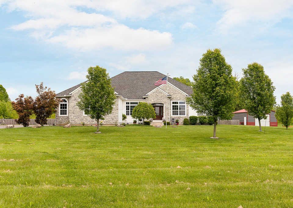 Text 190 to (614) 763-6690 for Instant Mobile Info! Call me today at (614) 726-6971 to schedule your private tour! Stunning custom-built ranch home situated on nearly 5 acres! Pocket doors accent the entry to the den and dining rooms, both with beautiful pewter maple flooring. Fantastic kitchen has SS appliances, granite counters, center island, pantry, butterscotch oak floors and lots of natural light! Enormous great room features a gas fireplace, recessed lighting, and vaulted ceilings, plus the nearby 4-season room fills with natural light. Master boasts 2 walk-in closets, pewter maple flooring, and a luxurious shower that includes a tower with 8 jets, waterfall, and rainfall shower heads. Two more bedrooms with new carpet in a split layout is perfect for guests. Sprawling basement is ready to finish. Large patio with multiple seating areas, fenced yard, and a 20x26 outbuilding too. Brand new HVAC!