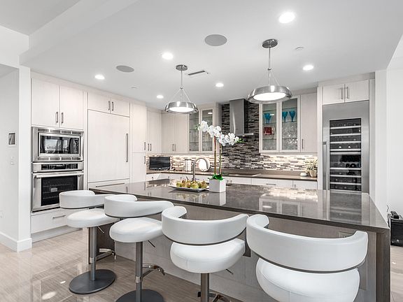 Chic modern residence featuring 4 bedrooms, 3.1 baths, 2 garage parking spots & 3,241 AC SF with best waterfront views in Azure. Newly constructed in 2017, this boutique condominium was built & engineered with the highest quality materials & finest workmanship with strict attention to detail. Other features include 10' ceilings throughout, impact resistant ceiling to floor sliding glass doors & windows for a cool contemporary look & providing lots of natural light, upgraded porcelain tile flooring throughout the entire condominium. The open Island kitchen is beautiful & functional with architectural grade cabinetry, quartz counters, Thermador refrigerator/freezer, 100-bottle built-in