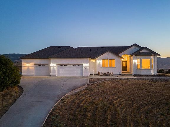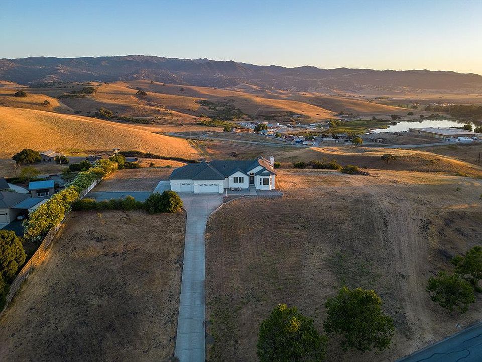 Welcome to Hollister Ranch Estates! Benefitted by the amenities of Hollister Ranch Estates but exempt from the CC&Rs, this custom built, single story home reflects the owners vision to maximize the views of the San Juan Valley and the surrounding hills. The 2235 sf home boasts wood beam ceilings & gorgeous wood burning fireplace in the living room making it the focal point of the home. Enjoy views from your gourmet kitchen which features granite counters, breakfast nook & breakfast bar, gas cooktop & large pantry. The home also features a formal dining room with built in cabinets, and den. The large primary suite features a walk in closet, the primary bathroom features dual sinks, walk in shower and great views from the oversized tub. The 3 1/2 car garage is finished, there is RV parking as well as a large parking area. Situated on 5 acres, this hilltop property has plenty of room for a shop, ADU and more!