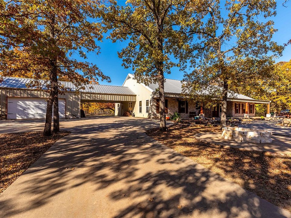 Secluded 1 story steel framed Texas Ranch Style custom home w metal roof behind a gated entry w 8 ft wildlife fence. Also, 600 sq ft log cabin guesthouse. 9.270 beautiful acres with mature trees and serene rural views and large pool. Family room Aspen Pine board on board vaulted ceiling w Knotty alder beams, kitchen with Knotty Alder cabinets, oversized master bedroom and a spacious master bath. Large covered porches are great for enjoying the view, upstairs has 2000 sq ft climate controlled storage with built in sink or could be converted to additional living space. Do not miss the oversized garage. Home is being sold as is but the seller will give up to $25,000 allowance for painting or updating with a strong offer.
